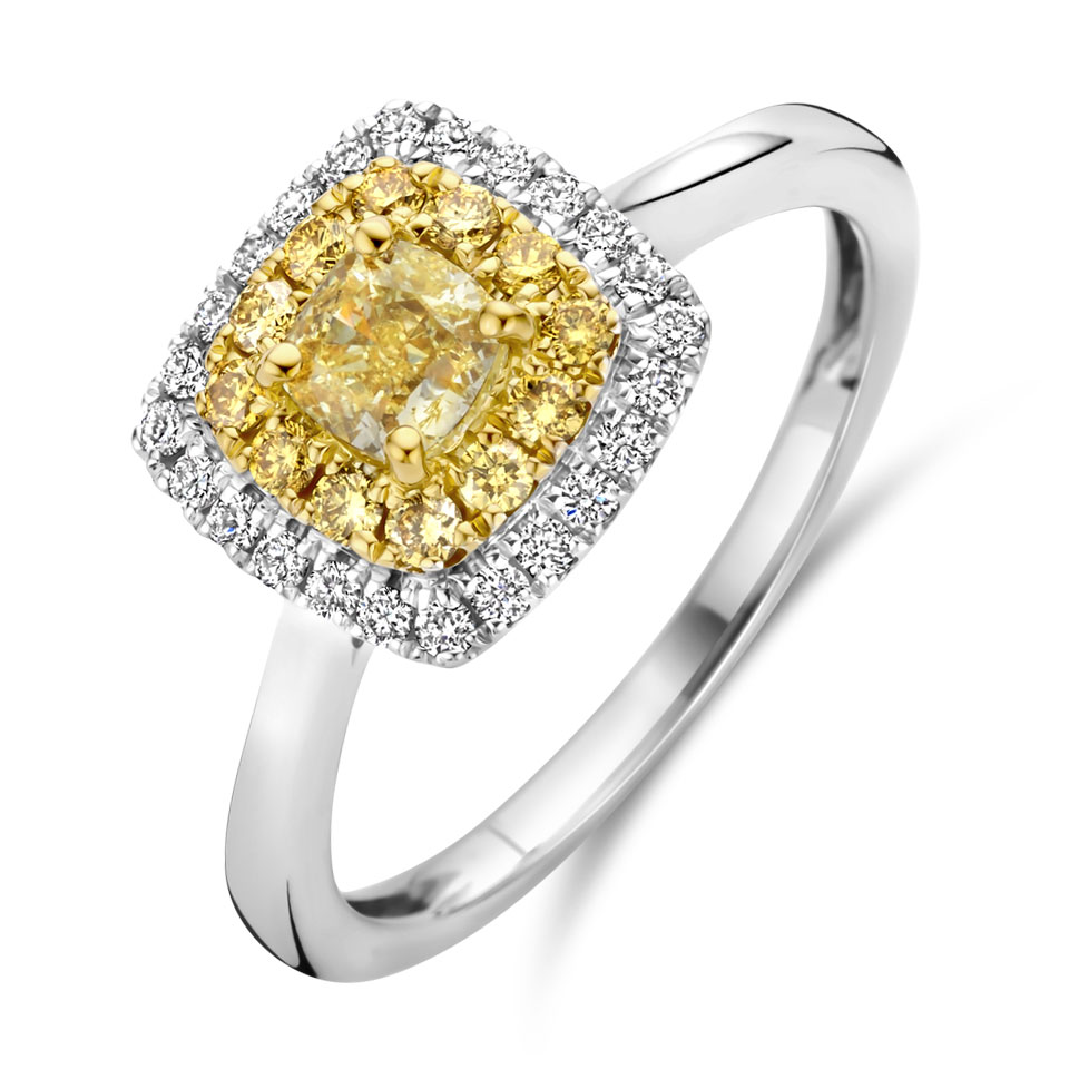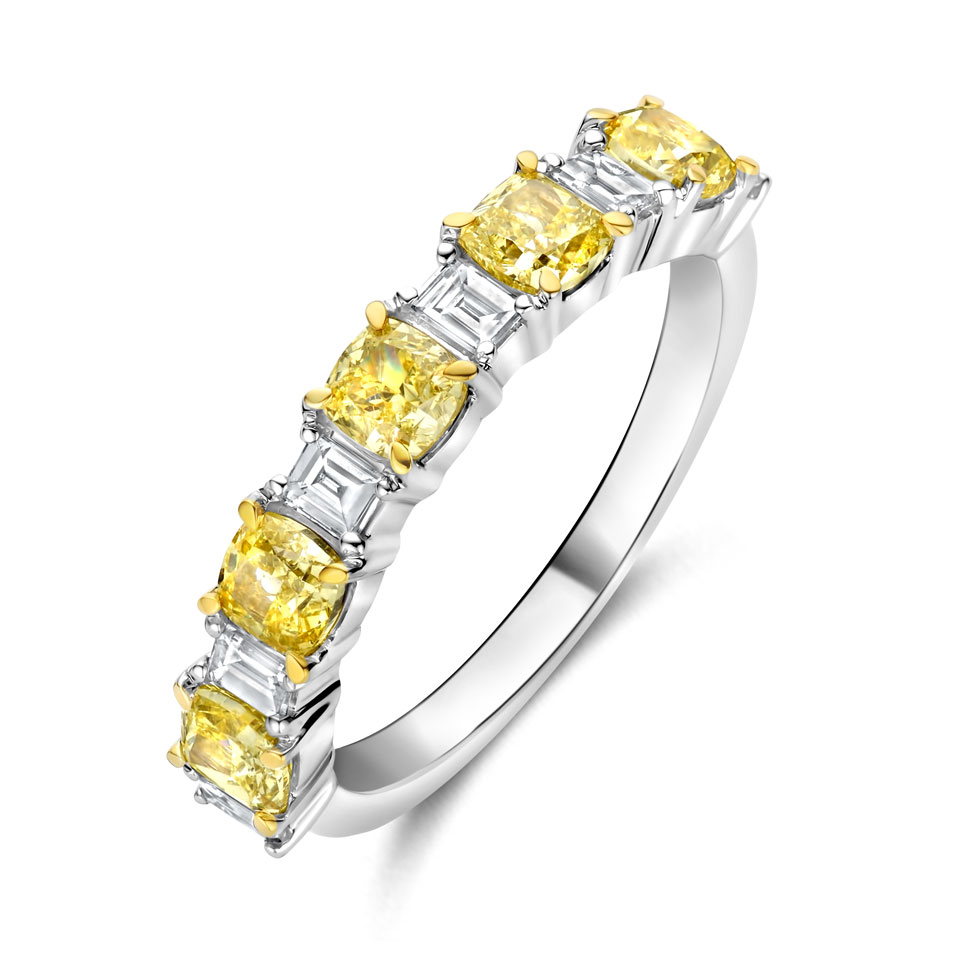 A white gold band, semi-set with yellow cushion-cut diamonds and emerald-cut diamonds, fancy and radiant, Tollet Joailliers Collection, €4,690.