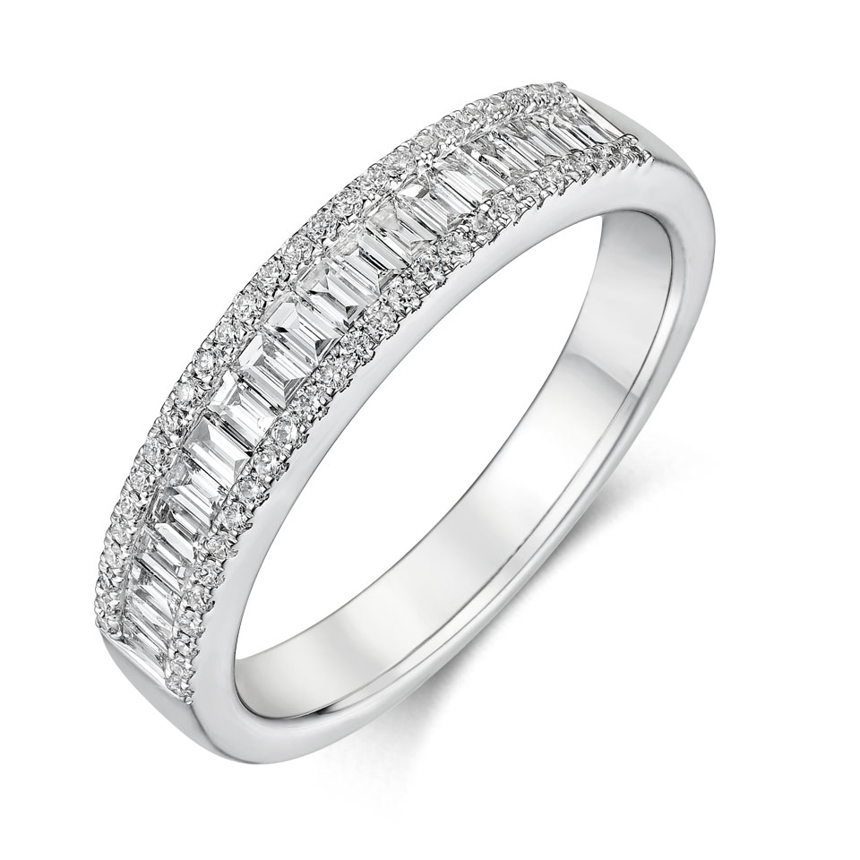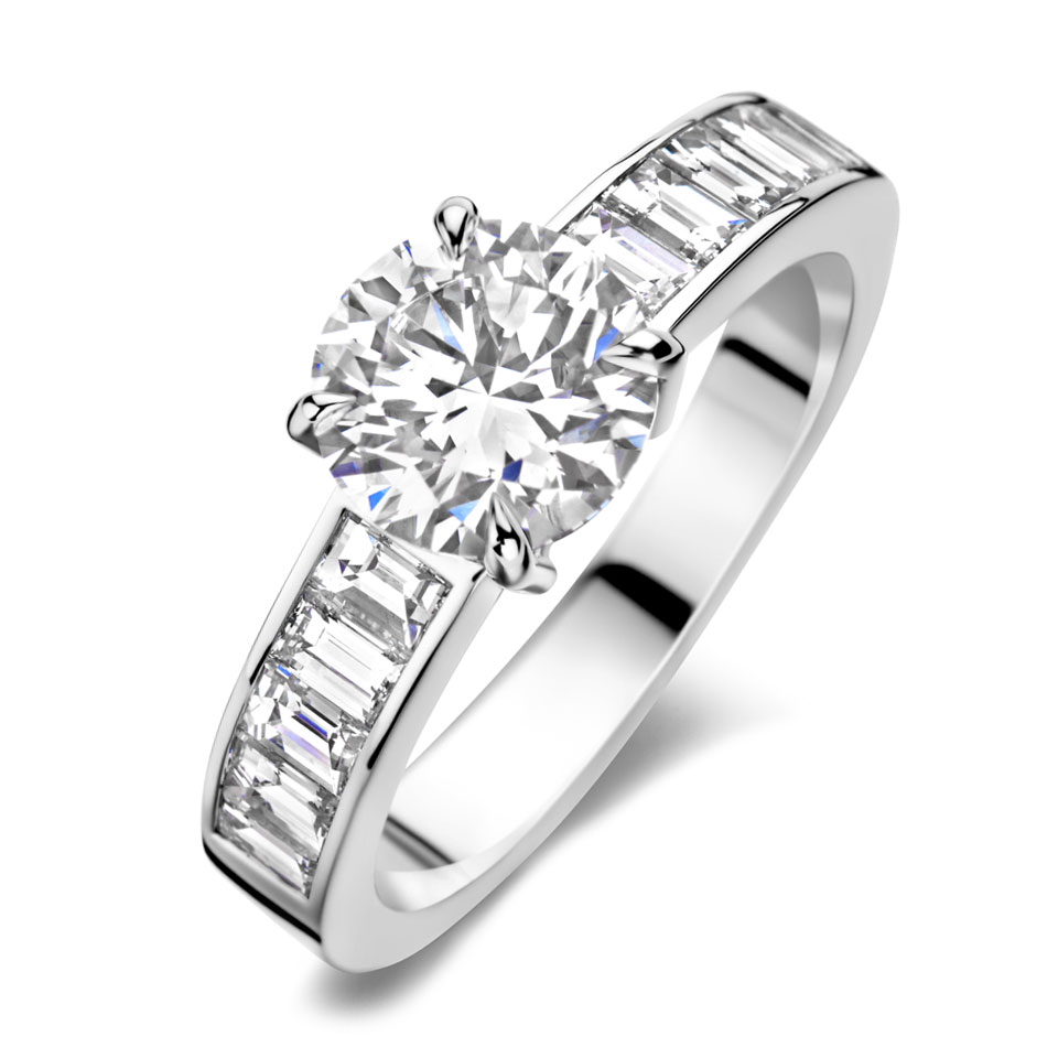 The brilliance of a solitaire set on a white gold band, adorned with a row of baguette-cut diamonds, a ring from the Tollet Joailliers Collection, price depending on carat weight.