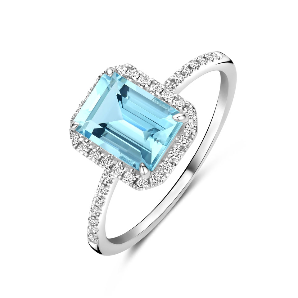 A luminous emerald-cut aquamarine (1.7 ct), surrounded by diamonds, adorns this semi-set white gold ring, €2,030.