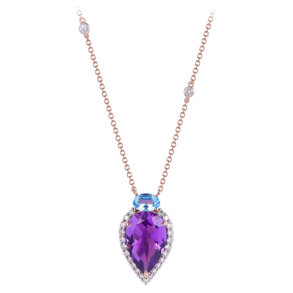 Sur chaîne d’or rose, un pendentif envoûtant mêle améthyste poire (3,60 cts) et topaze bleue, rehaussé de deux diamants,