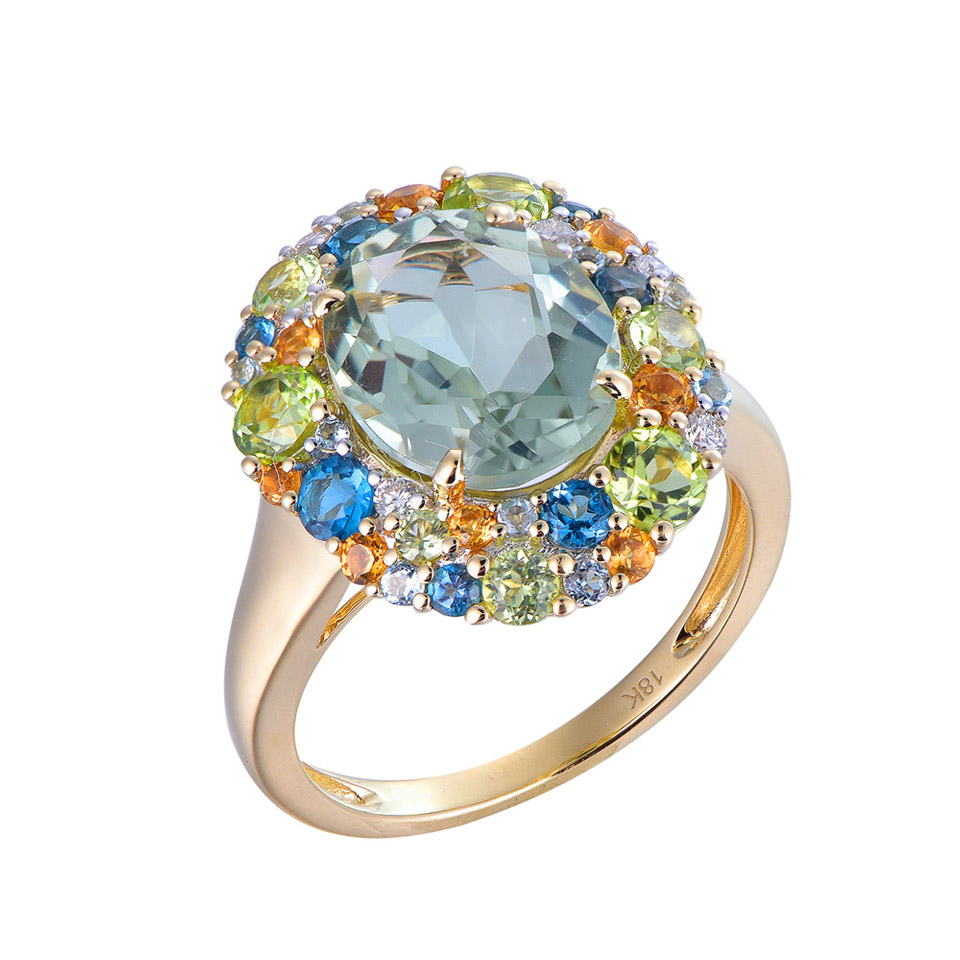 Autour d’un rare chrysobéryl bleu, améthystes, topazes et diamants composent une création en or blanc à l’élégance florale, 4.290 €.