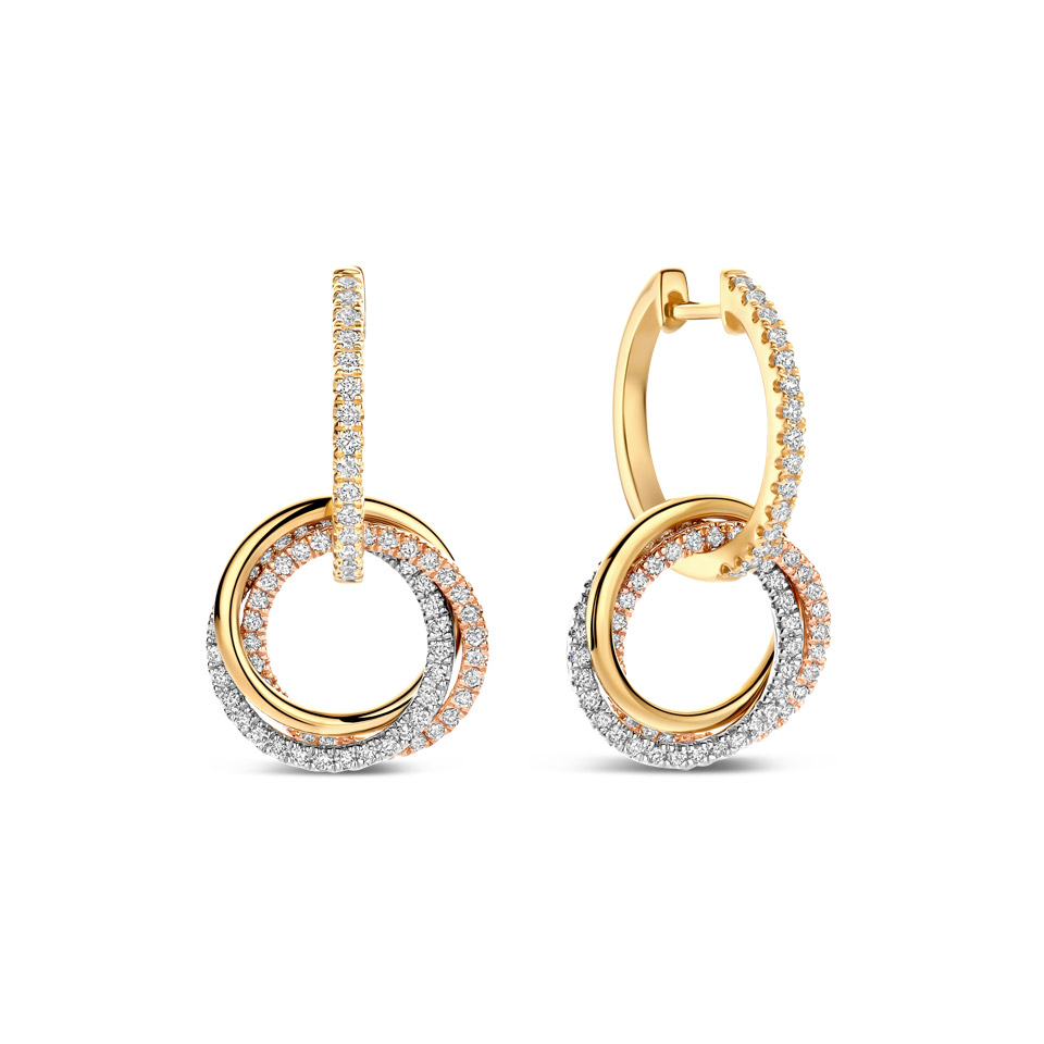 La douceur des trois ors rencontre l’éclat des diamants dans un jeu d’entrelacs lumineux, bague 3.990 €, pendentif 2.370 €.