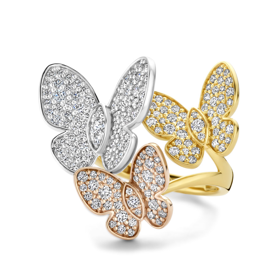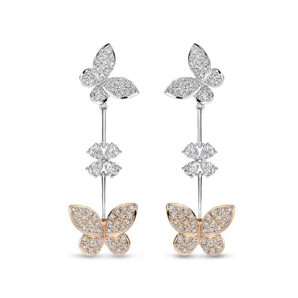 Des papillons d’or s’animent sous l’éclat des diamants, saphirs et rubis. Des créations aériennes, délicates et précieuses, qui célèbrent le mouvement et la lumière avec élégance.