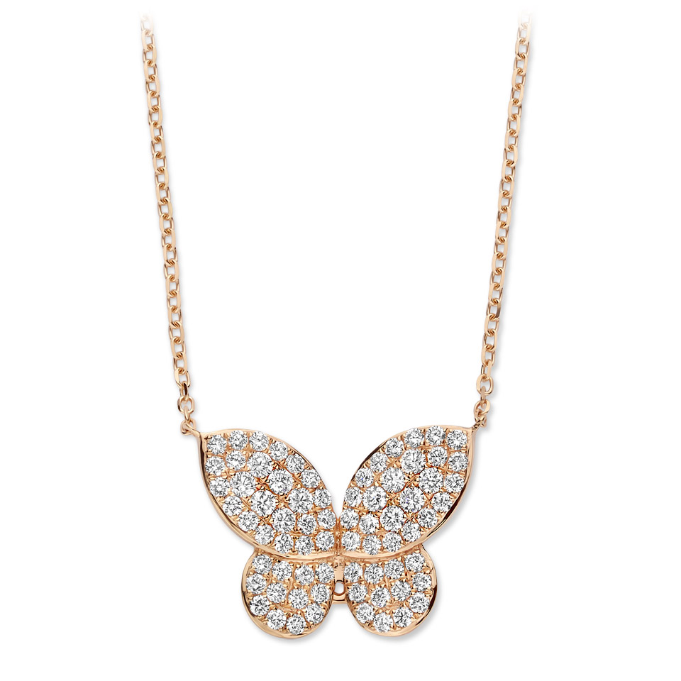 Un papillon d’or jaune aux ailes de diamants illumine ce pendentif aérien,